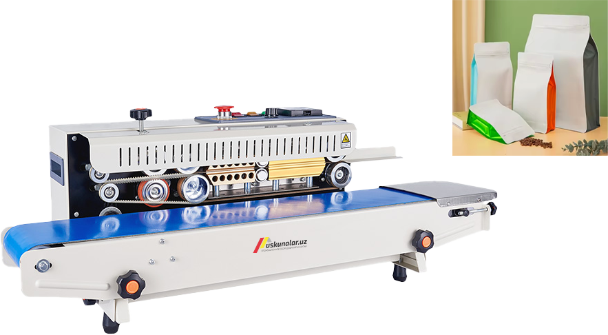 US-FR770-F — bo‘yalgan metall korpusga ega uzluksiz qadoqlash uskunasi bo‘lib, o‘rta va kichik ishlab chiqarish sexlari uchun moslashgan.