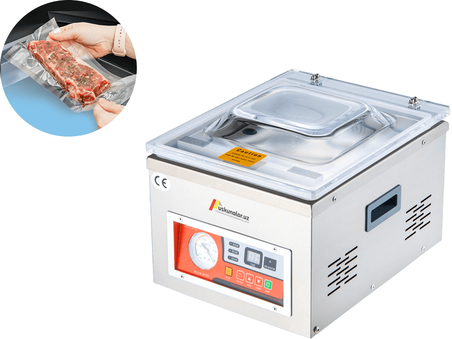 Ichki kamera o‘lchami 330 × 270 × 50 mm, go‘sht, pishloq, quruq mahsulotlar, elektro detallar va dori vositalarini qadoqlash uchun mos keladi.
