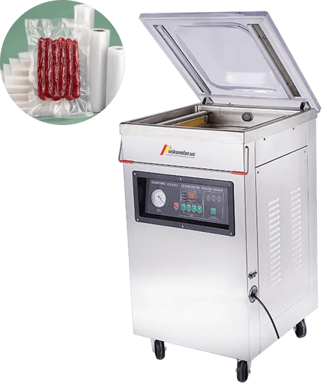 Zanglamaydigan po‘latdan yasalgan uskunaning qadoqlash kamerasi o‘lchami 520 × 520 × 75 mm bo‘lib, yirikroq mahsulotlarni qadoqlashga moslashtirilgan.