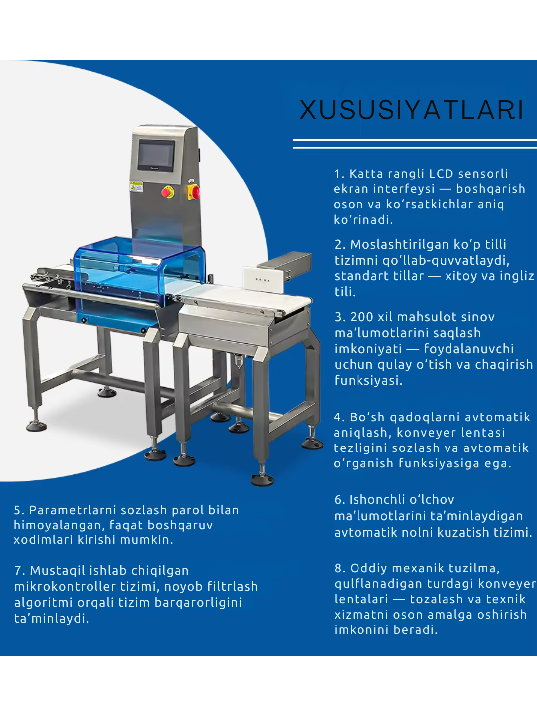 SK-150 — это высокоточный автоматический сортировочный станок с контролем веса 0.1 г. Оснащён сенсорным экраном, регулируемой высотой конвейера и корпусом из нержавеющей стали SUS304. Устройство минимизирует ошибки, повышает производительность и обеспечивает стабильный контроль качества благодаря автоматической системе отбраковки. ⚙️