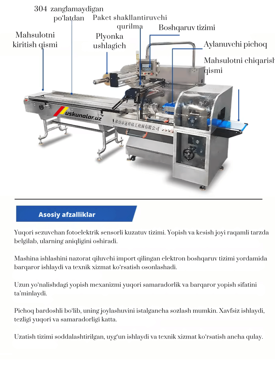 ✅ Автоматическая горизонтальная упаковка — высокая производительность и стабильность ✅ Управление через PLC и сенсорный экран — простота и точность настройки ✅ Корпус из SUS304 — гигиеничность и долговечность ✅ Энергосбережение и стабильная работа ✅ Универсальность — подходит для шоколада, батончиков, хлеба, вафель ✅ Качественная запайка (heat sealing) — надежная герметизация и привлекательный вид упаковки