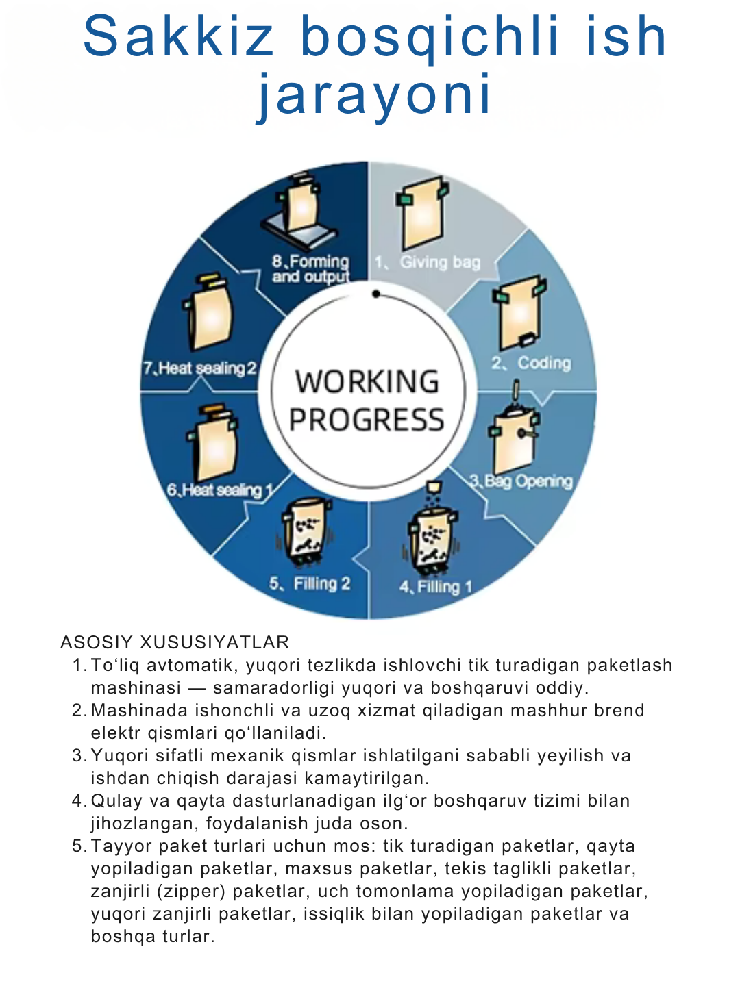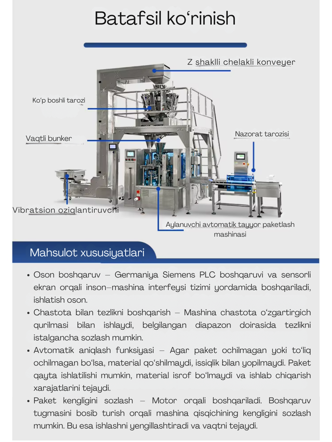Ushbu uskuna sizga yuqori aniqlik va tezlikda mahsulotni turli hajm va shakldagi doypack paketlarga joylash imkonini beradi. Kodlash, “zip-lock”, va “exhaust” kabi qo‘shimcha funksiyalar qo‘shilishi mumkin. Ish jarayoni to‘liq avtomatlashtirilgan — siz faqat sifatli natijani olasiz.