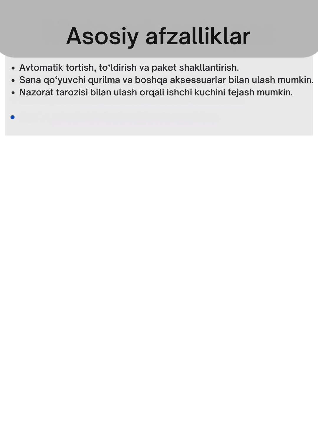 ✅ Yuqori aniqlik va tezlik (45–60 paket/min)