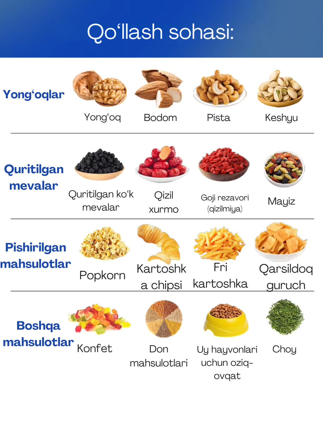 Choy 🍵 | Qahva ☕ | Ziravorlar 🌿 | Makaron 🍝 | Spagetti 🍜 | Un 🌾 | Shakar 🍬 | Sut kukuni 🥛 | Yorma 🍚 | Dori vositalari 💊 | Oziq-ovqat aralashmalari | Kukunli va donador mahsulotlar