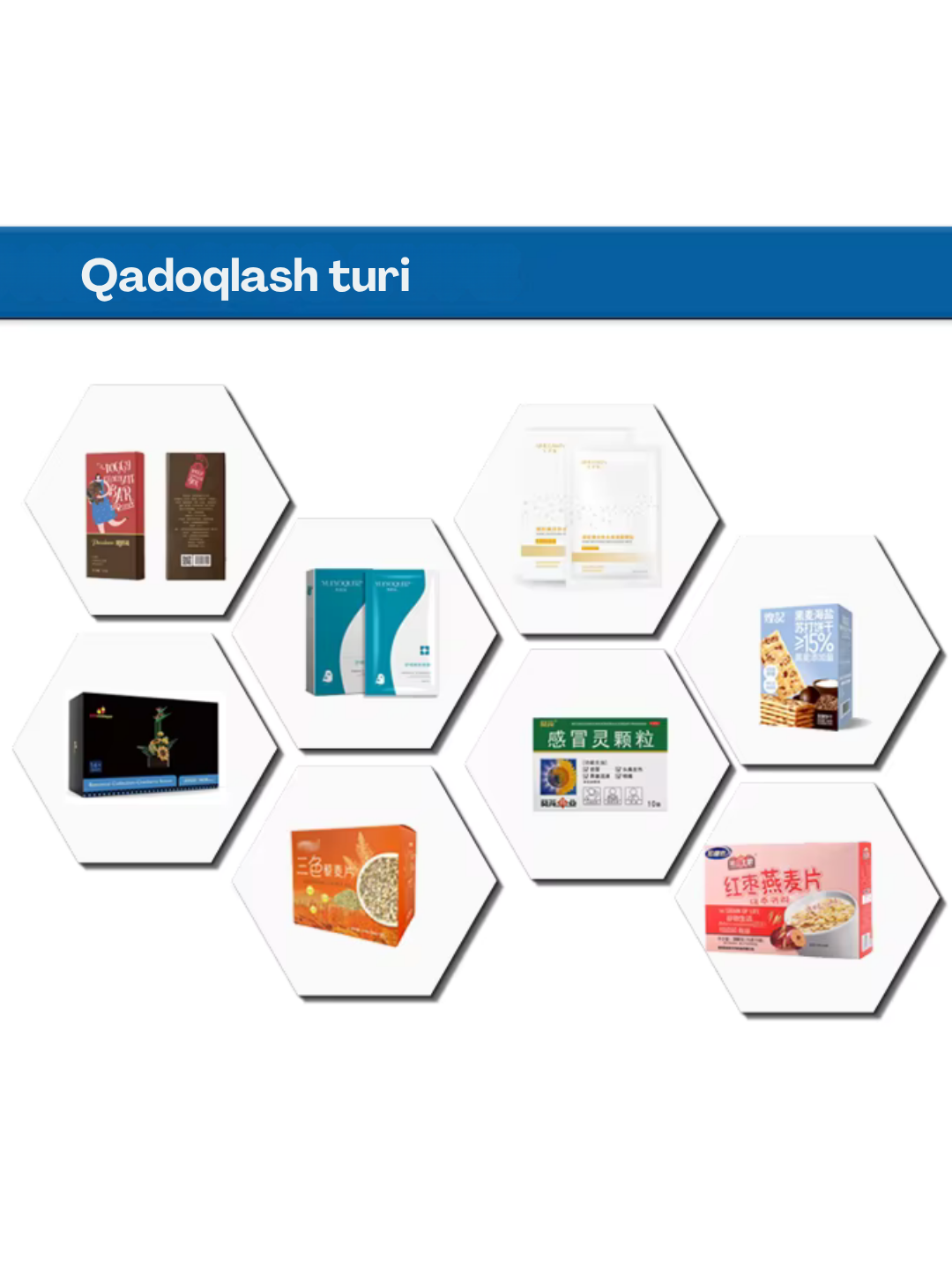 Karton qutilarga shampun, sovun, kosmetika, tish pastasi, dorivor vositalar, oziq-ovqat va ichimlik mahsulotlarini avtomatik joylashtirish uchun mo‘ljallangan.